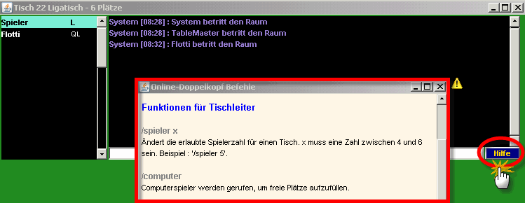 Die möglichen Eingaben des jeweiligen Tischleiters erscheinen in einem kleinen Fenster nach dem Klicken auf 'Hilfe'.